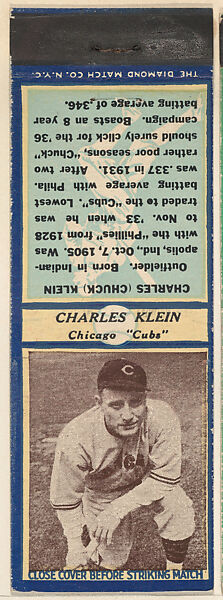 - Title: Charles Klein, Chicago Cubs, from the Baseball Players Match Cover design series (U3) issued by Diamond Match Company