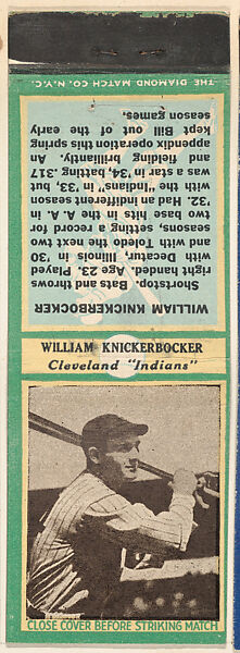 - Title: William Knickerbocker, Cleveland Indians, from the Baseball Players Match Cover design series (U3) issued by Diamond Match Company