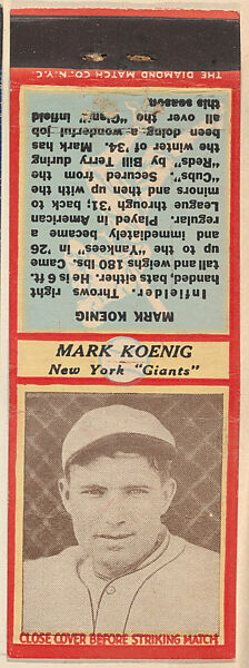 - Title: Mark Koenig, New York Giants, from the Baseball Players Match Cover design series (U3) issued by Diamond Match Company