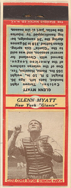 - Title:Glenn Myatt, New York Giants, from the Baseball Players Match Cover design series (U3) issued by Diamond Match Company