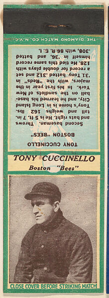 - Title:Tony Cuccinello, Boston Bees, from the Baseball Players Match Cover design series (U4) issued by Diamond Match Company
