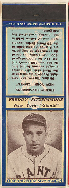 - Title: Freddy Fitzsimmons, New York Giants, from the Baseball Players Match Cover design series (U4) issued by Diamond Match Company