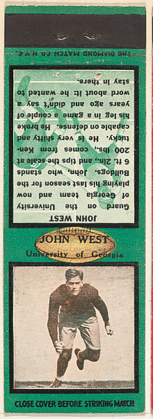 - Title:John West, University of Georgia, from the Football Players Match Cover design series (U6) issued by Diamond Match Company