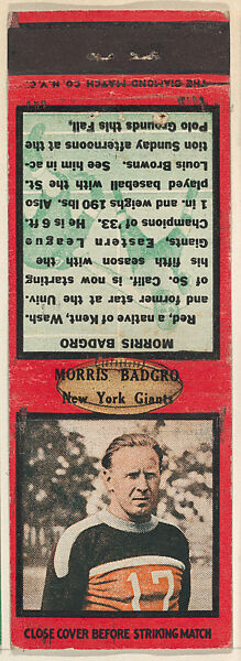 - Title: Morris Badgro, New York Giants, from the Football Players Match Cover design series (U6) issued by Diamond Match Company