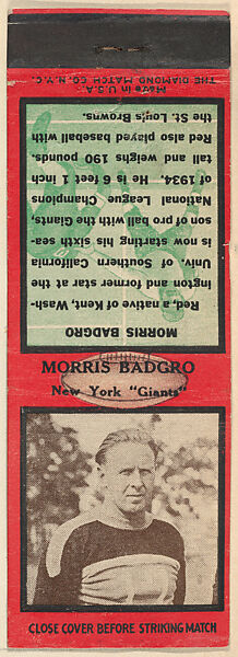 - Title:Morris Badgro, New York Giants, from the Football Players Match Cover design series (U6) issued by Diamond Match Company