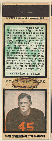 - Title:Myers "Algy" Clark, Cincinnati Reds, from the Football Players Match Cover design series (U6) issued by Diamond Match Company