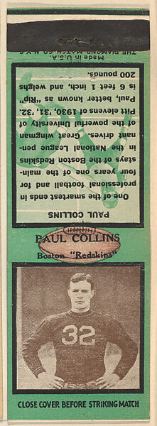 - Title: Paul Collins, Boston Redskins, from the Football Players Match Cover design series (U6) issued by Diamond Match Company