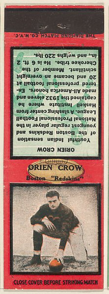 - Title: Orien Crow, Boston Redskins, from the Football Players Match Cover design series (U6) issued by Diamond Match Company