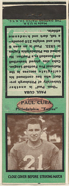 - Title: Paul Cuba, Philadelphia Eagles, from the Football Players Match Cover design series (U6) issued by Diamond Match Company