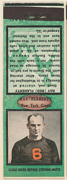 - Title:Ray Flaherty, New York Giants, from the Football Players Match Cover design series (U6) issued by Diamond Match Company