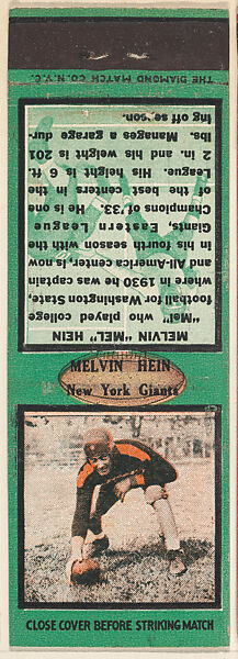 - Title:Melvin Hein, New York Giants, from the Football Players Match Cover design series (U6) issued by Diamond Match Company