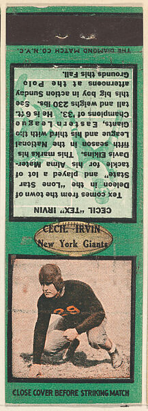 - Title: Cecil Irvin, New York Giants, from the Football Players Match Cover design series (U6) issued by Diamond Match Company