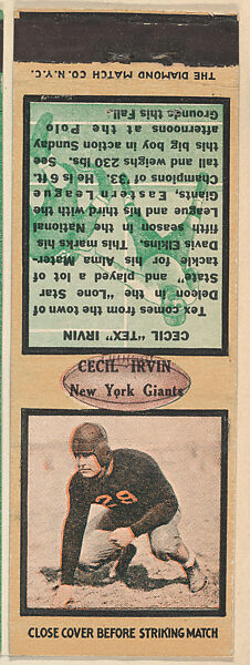 - Title: Cecil Irvin, New York Giants, from the Football Players Match Cover design series (U6) issued by Diamond Match Company