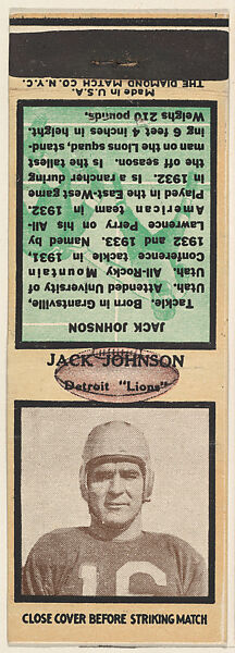 - Title: Jack Johnson, Detroit Lions, from the Football Players Match Cover design series (U6) issued by Diamond Match Company
