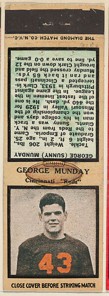 - Title: George Munday, Cincinnati Reds, from the Football Players Match Cover design series (U6) issued by Diamond Match Company