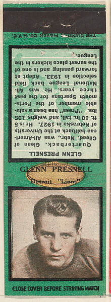 - Title:Glenn Presnell, Detroit Lions, from the Football Players Match Cover design series (U6) issued by Diamond Match Company