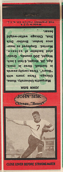 - Title: John Sisk, Chicago Bears, from the Football Players Match Cover design series (U6) issued by Diamond Match Company