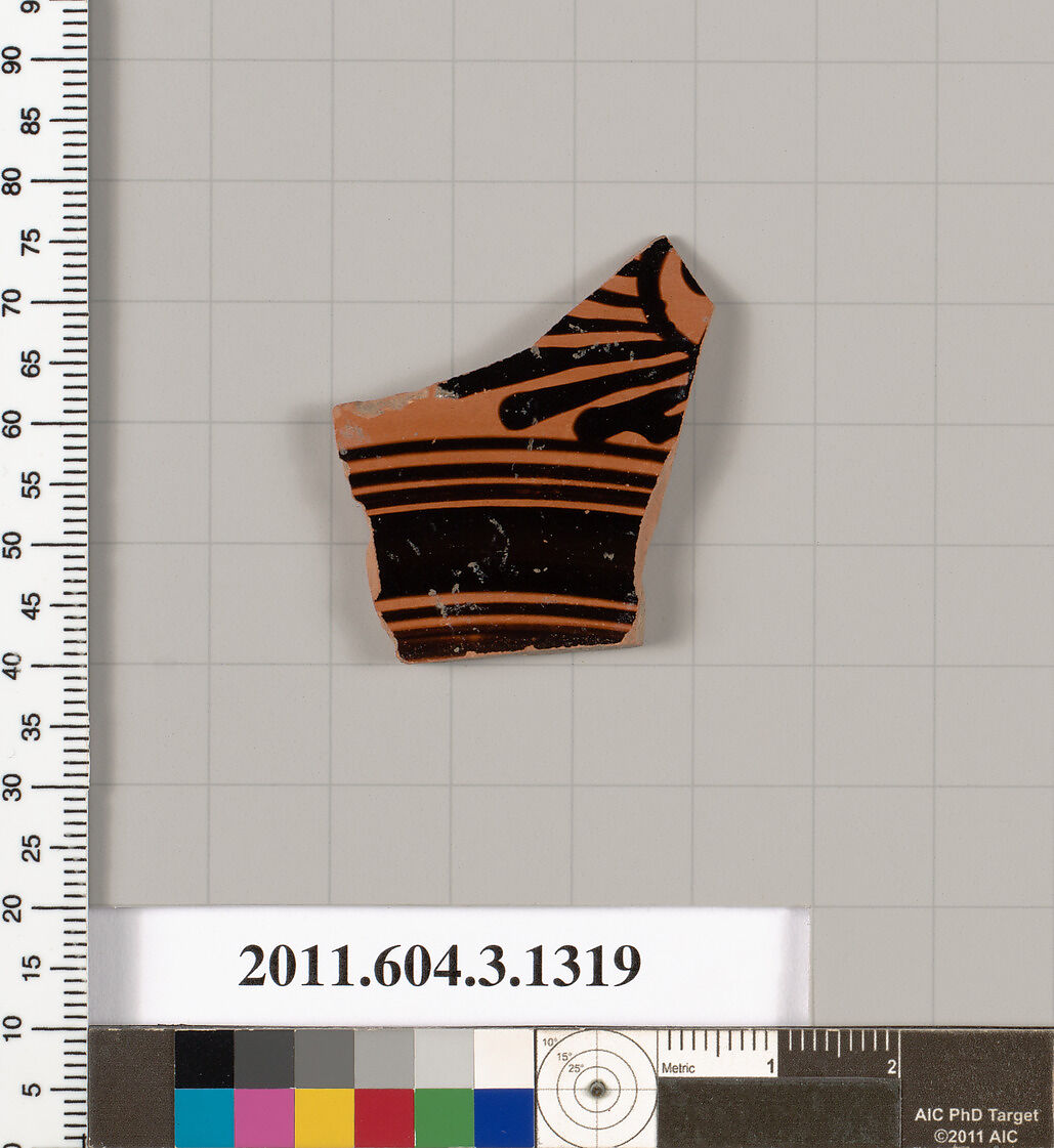 Part of a palmette; four thin lines of black glaze interrupted by bands of reserve; wide band of black glaze; thin black glazed line framed by a band of reserve on the top and bottom; black glaze