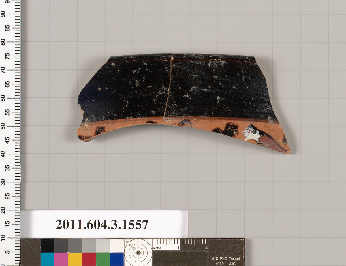 - Title:Terracotta rim fragment of a kylix: Band cup (drinking cup)