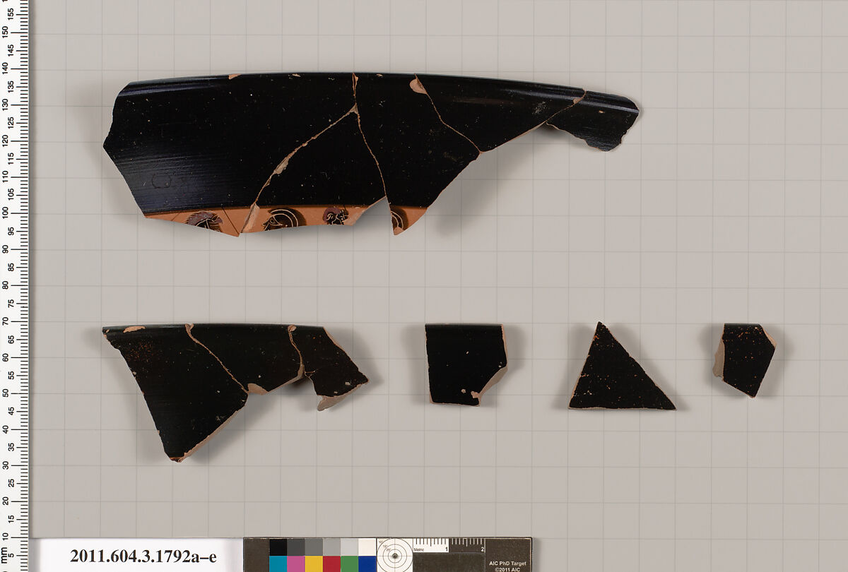 - Title:Terracotta fragments of a kylix: Band cup (drinking cup)