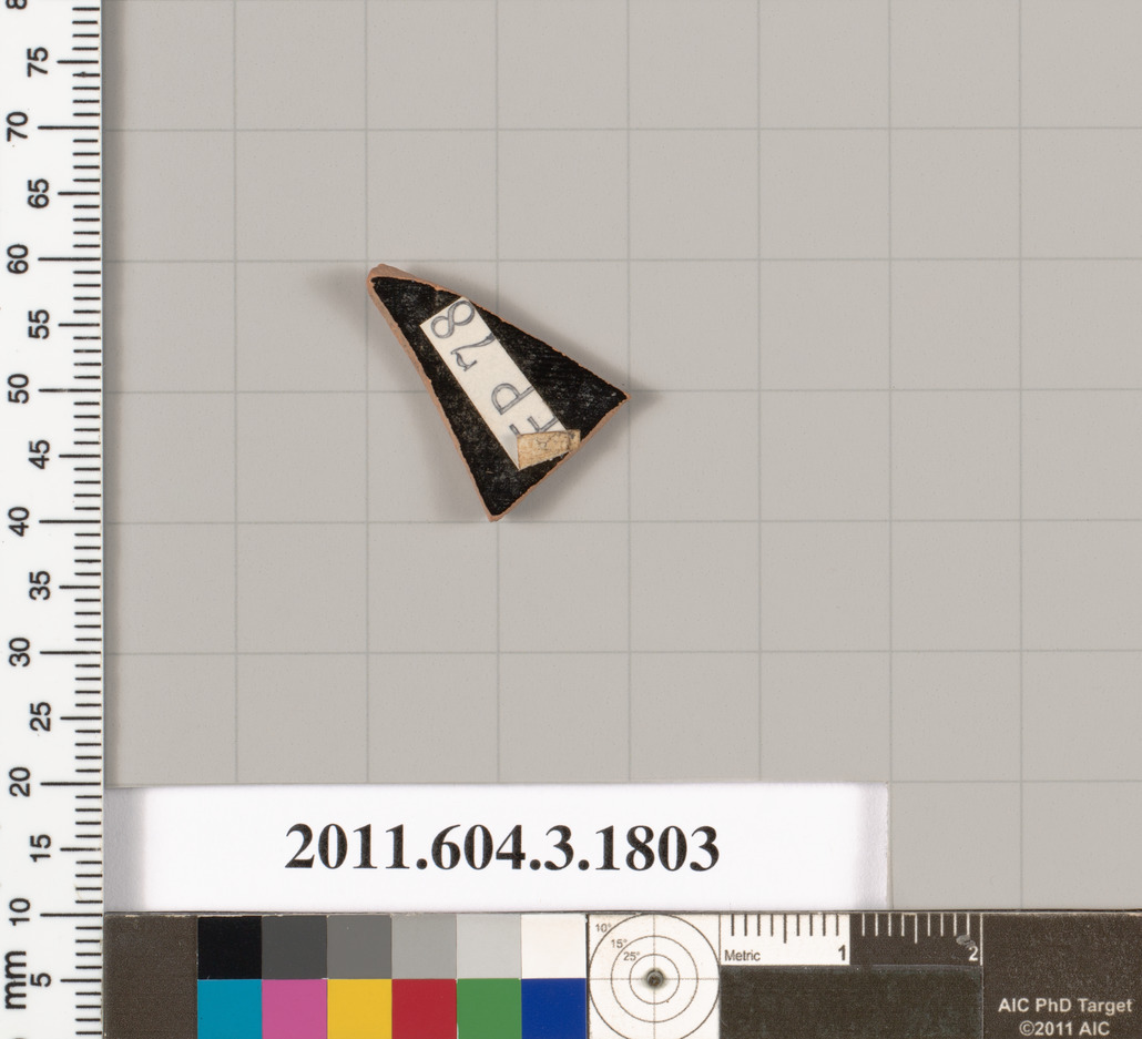 Exterior, in the handle zone, a palmette with a tendril; below, black glaze