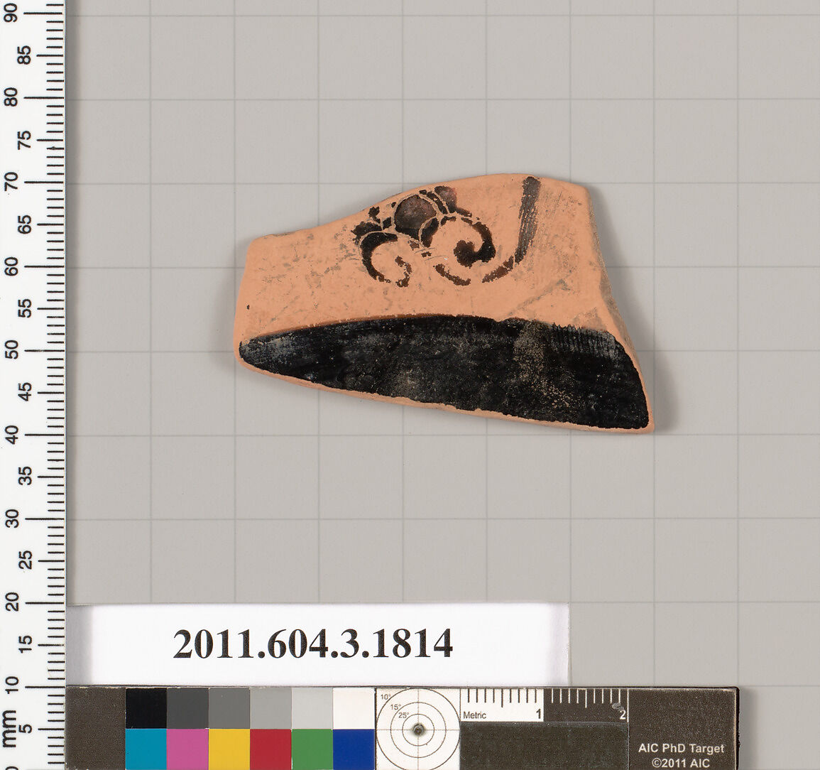 - Title:Terracotta fragment of a kylix: Lip cup (drinking cup)