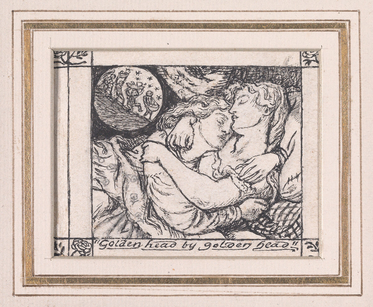 In August 1861, Rossetti proposed to the publisher Alexander Macmillan that he create"brotherly designs" to illustrate a volume of his sister Christina's poetry. This drawing is reproduced on the title page of "The Goblin Market and Other Poems." Finished by mid-December, the image was transfered to a wooden block by Rossetti, engraved by William J. Linton and printed and published in April 1862. As if in a fairy tale, we glimpse sisters sleeping in a curtained bed as goblins cavort in the background, the design echoing the related poem which treats temptation and addiction in a symbolic manner and evokes their strength through heightened, sensual verse. At an earlier moment in the story Lizzie manages to resist the goblins's offer of luscious fruit, but Laura succumbs. The young women here sleep peacefully, unaware of the addictive substance that will soon bring Laura close to death and force her sister to undertake an heroic confrontation with the goblins.