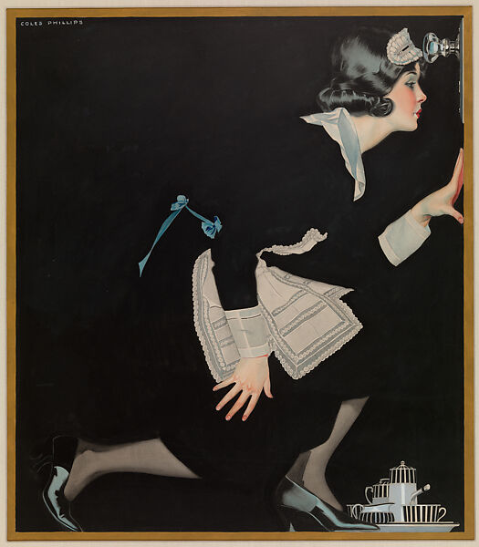 Coles Phillips embodies innovative American periodical and advertising design between 1911 and 1927, a period considered a Golden Age of illustration. In 1907 he became a staff artist at Life Magazine, and the following year created his first "fadeaway girl" design in which the color of the figure's clothing and background are the same. This punningly titled image of a maid peeking through a keyhole is a fine example, with the figure's uniform disappearing into the surrounding ground. Not only is the viewer encouraged to imaginatively fill-in the form, but the magazine reduced costs by using only a few colors of printing ink. Such images, designed for Life and Good Housekeeping to advertize products sold by Overland automobiles and Luxite hosiery, often centered on a type of young, alluring female that became known as the "Phillips Girl."