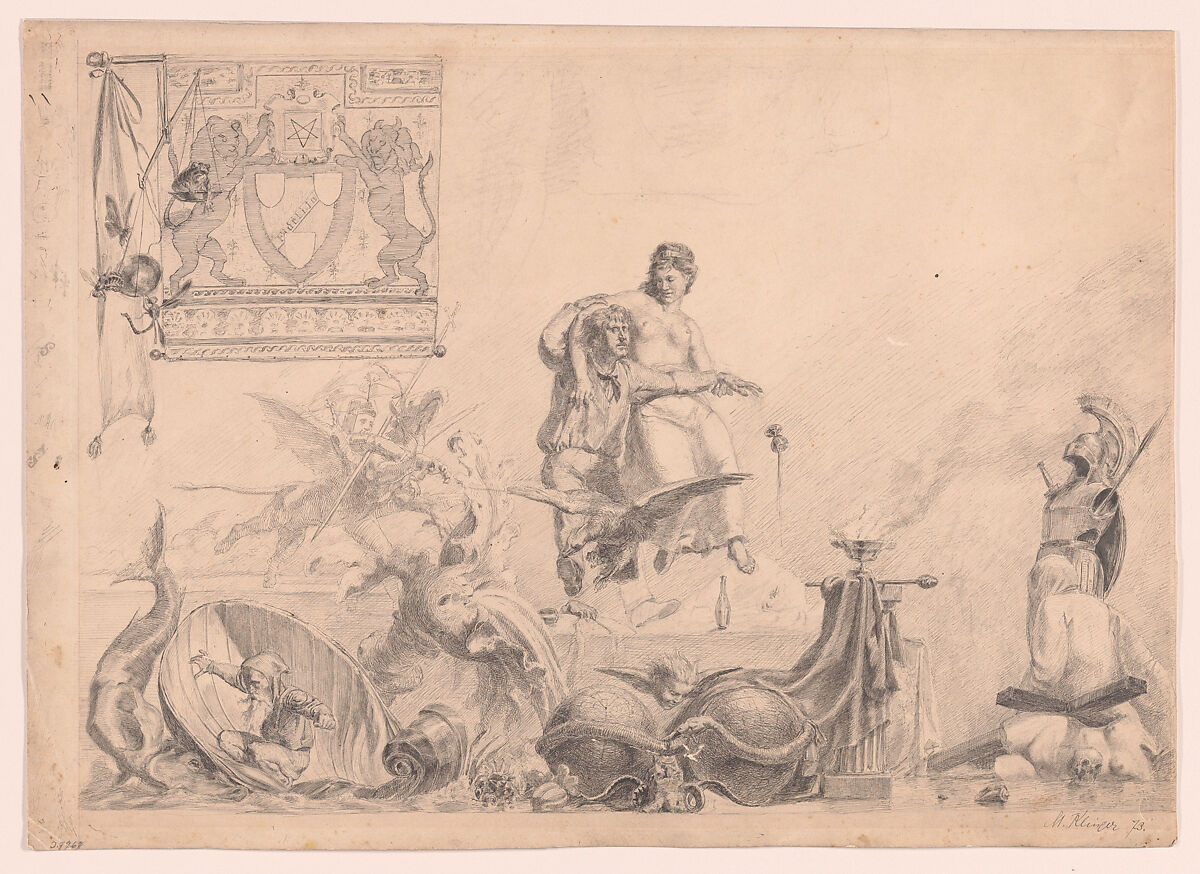 Phantasie und Künstler is a design for an invitation to a party at the Karlsruhe Akademie where Klinger was a student in 1872-73. An inventive and exuberant work, the sketch on the verso shows an alternate design for the composition and provides insight into Klinger's workiing method. The subject is the combination of art and Eros that pervades the artist's oeuvre and for which he was famous.