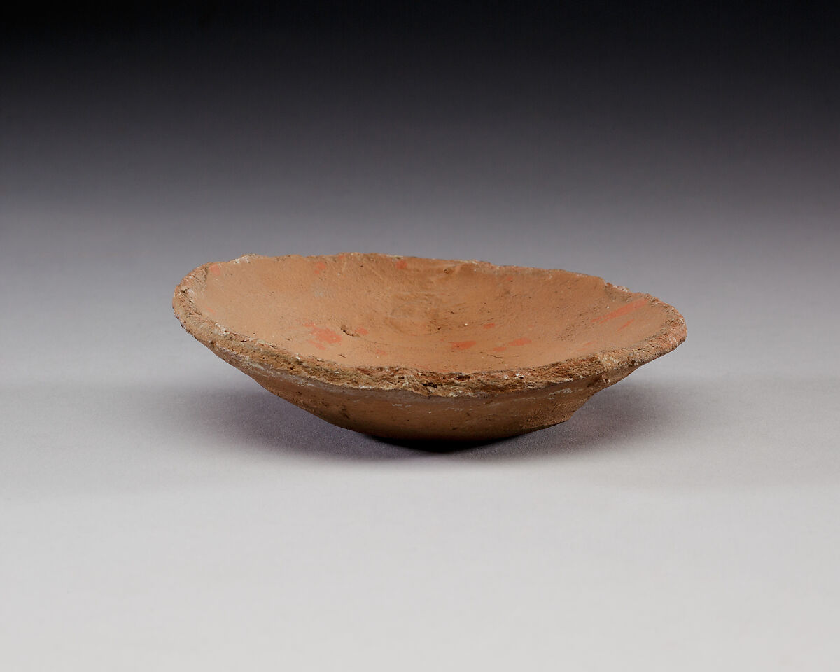 This small red ware dish was used as a lid for a pitcher that was found in the tomb of an unnamed woman. The dish was placed up-side-down over the mouth of the jar and its edges were trimmed to correspond to the lip of the jar.