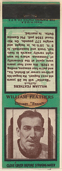 - Title: William Feathers, Chicago Bears, from the Football Players Match Cover design series (U7) issued by Diamond Match Company