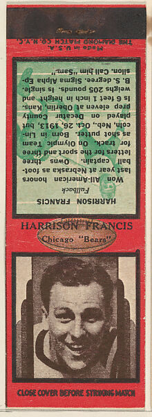 - Title:Harrison Francis, Chicago Bears, from the Football Players Match Cover design series (U7) issued by Diamond Match Company