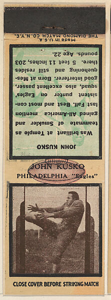 - Title:John Kusko, Philadelphia Eagles, from the Football Players Match Cover design series (U7) issued by Diamond Match Company