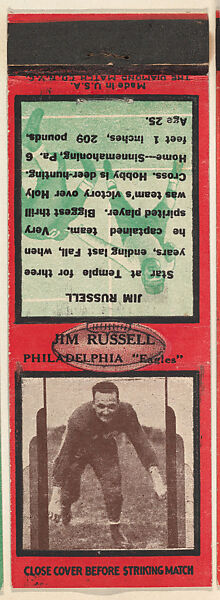 - Title:Jim Russell, Philadelphia Eagles, from the Football Players Match Cover design series (U7) issued by Diamond Match Company