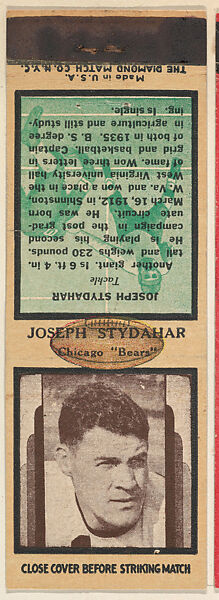- Title:Joseph Stydahar, Chicago Bears, from the Football Players Match Cover design series (U7) issued by Diamond Match Company