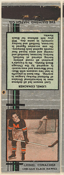 - Title:Lionel Conacher, Chicago Black Hawks, from Silver Hockey Players Match Cover design series (U9) issued by Diamond Match Company