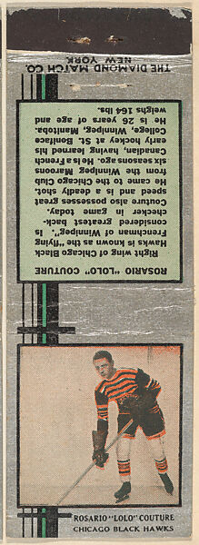 Rosario "Lolo" Couture, Chicago Black Hawks, from Silver Hockey Players Match Cover design series (U9) issued by Diamond Match Company