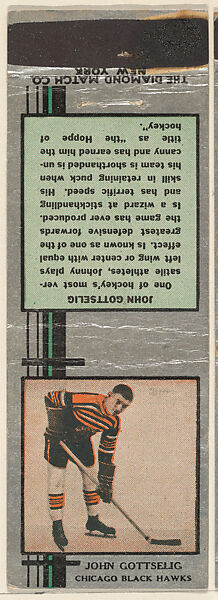 - Title:John Gottselig, Chicago Black Hawks, from Silver Hockey Players Match Cover design series (U9) issued by Diamond Match Company