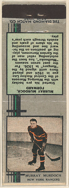 - Title: Murray Murdoch, New York Rangers, from Silver Hockey Players Match Cover design series (U9) issued by Diamond Match Company