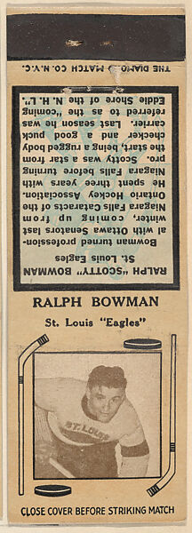 - Title:Ralph Bowman, St. Louis Eagles, from Yellow/Tan Hockey Players Match Cover design series (U10) issued by Diamond Match Company