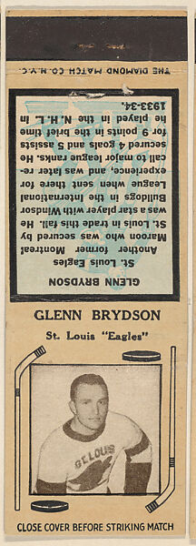 - Title:Glenn Brydson, St. Louis Eagles, from Yellow/Tan Hockey Players Match Cover design series (U10) issued by Diamond Match Company