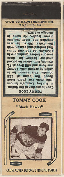 - Title:Tommy Cook, Black Hawks, from Yellow/Tan Hockey Players Match Cover design series (U10) issued by Diamond Match Company