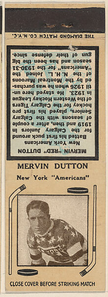 - Title:Mervin Dutton, New York Americans, from Yellow/Tan Hockey Players Match Cover design series (U10) issued by Diamond Match Company