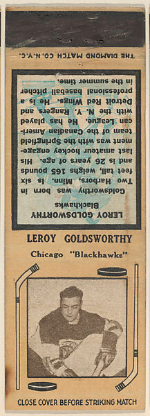 - Title: Leroy Goldsworthy, Chicago Blackhawks, from Yellow/Tan Hockey Players Match Cover design series (U10) issued by Diamond Match Company