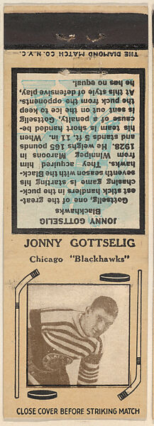 - Title:Jonny Gottselig, Chicago Blackhawks, from Yellow/Tan Hockey Players Match Cover design series (U10) issued by Diamond Match Company