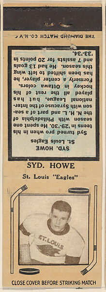 - Title:Syd. Howe, St. Louis Eagles, from Yellow/Tan Hockey Players Match Cover design series (U10) issued by Diamond Match Company