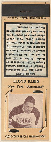 - Title: Lloyd Klein, New York Americans, from Yellow/Tan Hockey Players Match Cover design series (U10) issued by Diamond Match Company
