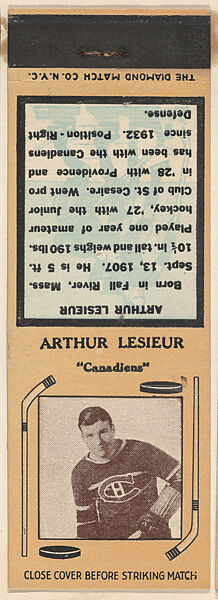 - Title:Arthur Lesieur, Canadiens, from Yellow/Tan Hockey Players Match Cover design series (U10) issued by Diamond Match Company
