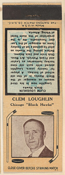 - Title: Clem Loughlin, Chicago Black Hawks, from Yellow/Tan Hockey Players Match Cover design series (U10) issued by Diamond Match Company