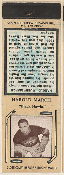 - Title: Harold March, Black Hawks, from Yellow/Tan Hockey Players Match Cover design series (U10) issued by Diamond Match Company